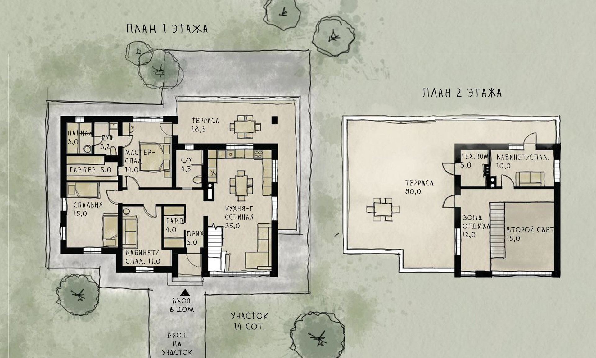 Эргономика 130 м²: На ограниченной площади первого этажа удалось разместить изолированный блок спален с мастер-спальней и сауной, и просторную кухню-гостиную с камином и выходом на участок. На втором этаже зона отдыха с выходом на террасу на крыше.